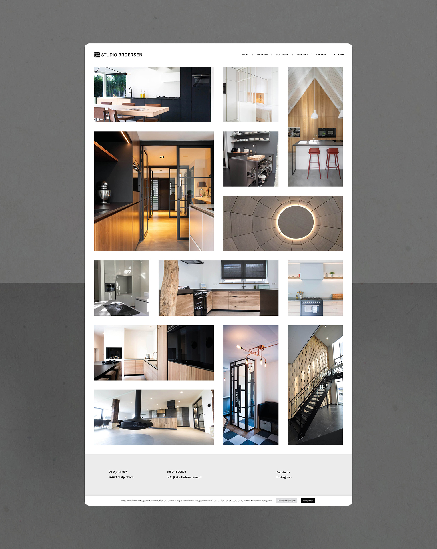 Studio Broersen ontwerpt en ontwikkeld prachtige keukens en interieurs. Experimenteel materiaalgebruik en een geheel eigen visie maken de producten van Studio Broersen uniek. Dit concept heb ik doorgetrokken in de huisstijl en website.